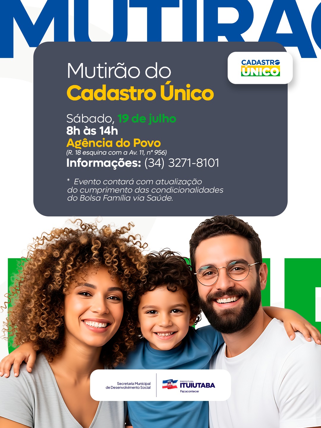 A Prefeitura de Ituiutaba, por meio da Secretaria de Desenvolvimento Social, promove no próximo sábado, 19 de julho, mais uma edição do Mutirão do Cadastro Único. A ação será realizada na Agência do Povo, das 8h às 14h, e tem como principal objetivo facilitar o acesso da população aos programas sociais do Governo Federal, com foco especial na atualização de dados e no cumprimento das condicionalidades do Bolsa Família.