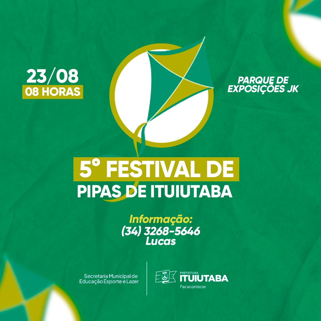 A Prefeitura de Ituiutaba, por meio da Secretaria de Educação, Esporte e Lazer, abriu as inscrições para o 5º Festival de Pipas, que será realizado no dia 23 de agosto. O evento será realizado a partir das 8h, no Parque de Exposições JK, no Bairro Alvorada, e é aberto a participantes de todas as idades.