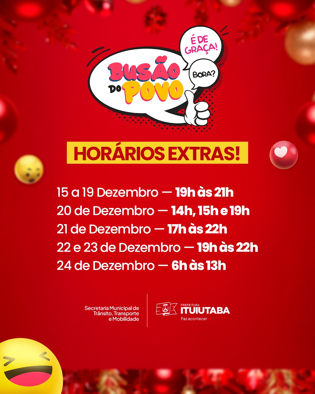 Entre os dias 15 e 24 de dezembro, o transporte público gratuito contará com linhas e horários extras, principalmente no período noturno, ligando os bairros ao Centro da cidade. A iniciativa busca facilitar o deslocamento dos moradores, incentivar o comércio local e permitir que famílias de todas as regiões participem da programação cultural e religiosa do Natal Ituiutaba.