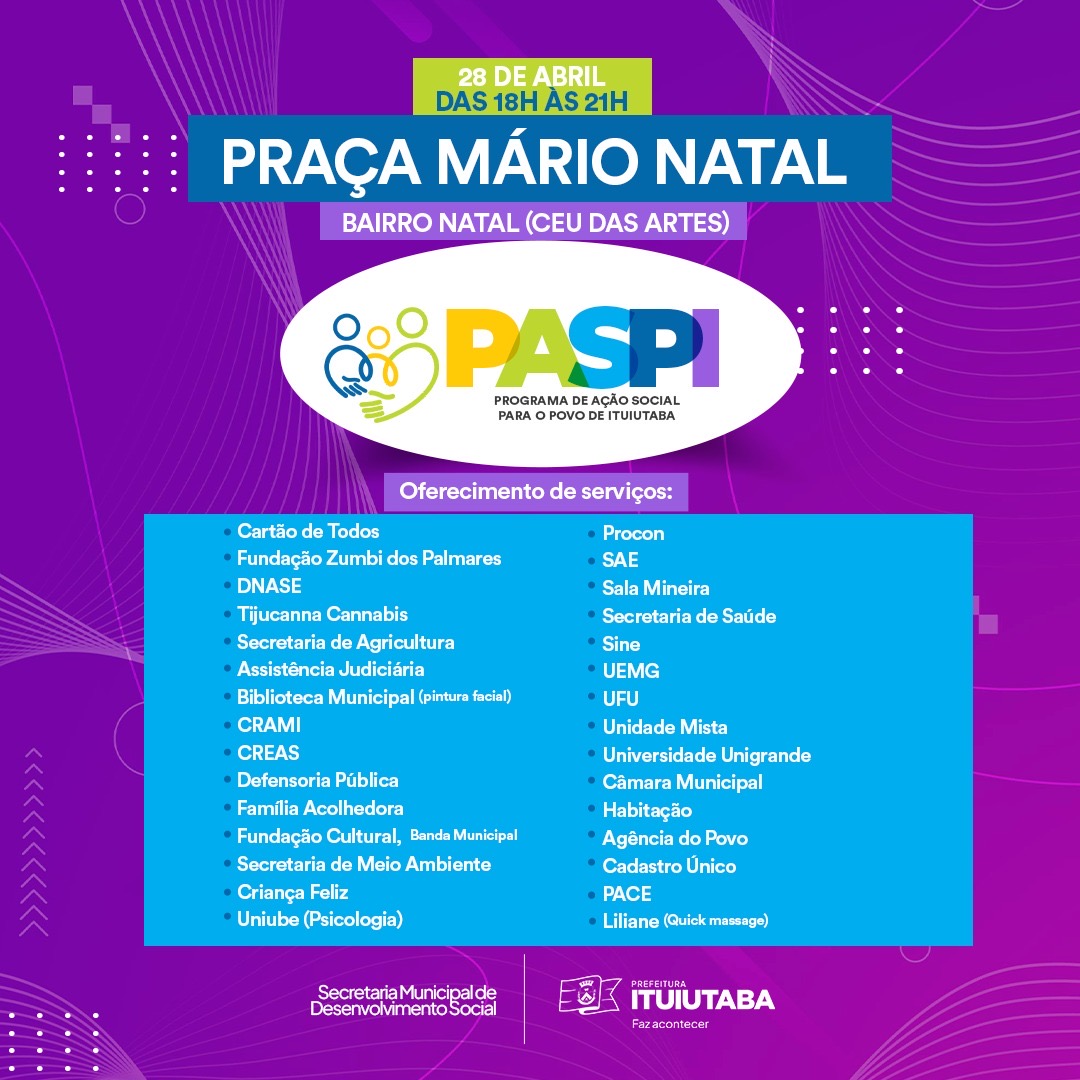 A Prefeitura de Ituiutaba, por meio da Secretaria de Desenvolvimento Social, realizará, na próxima terça-feira, 28 de abril, mais uma edição do Programa de Ação Social para o Povo de Ituiutaba (PASPI). O evento, que ocorrerá das 18h às 21h, levará uma série de serviços gratuitos à população do bairro Natal e região.