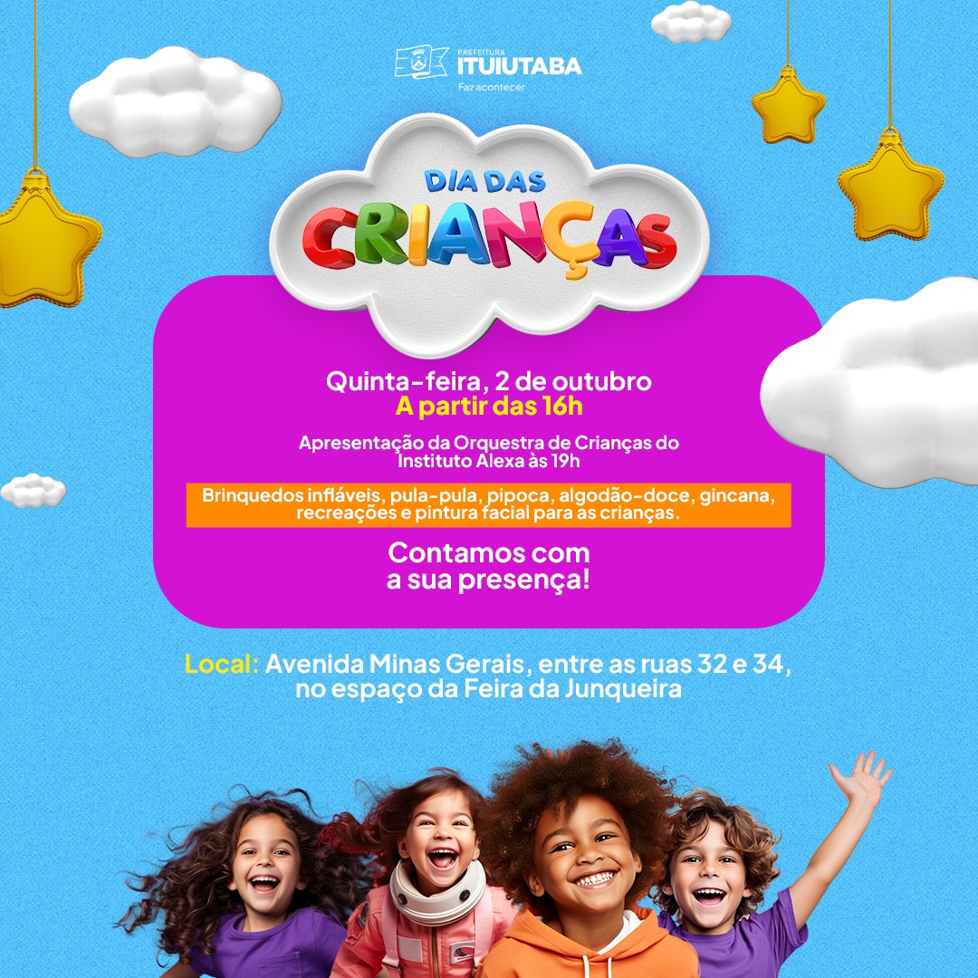 A Prefeitura de Ituiutaba, por meio da Secretaria de Desenvolvimento Social, realizará nesta quinta-feira, 2 de outubro, uma programação especial em comemoração ao Dia das Crianças. O evento está marcado para as 16h, na Avenida Minas Gerais, entre as ruas 32 e 34, no espaço da tradicional Feira da Junqueira, e contará com atividades gratuitas abertas à população.