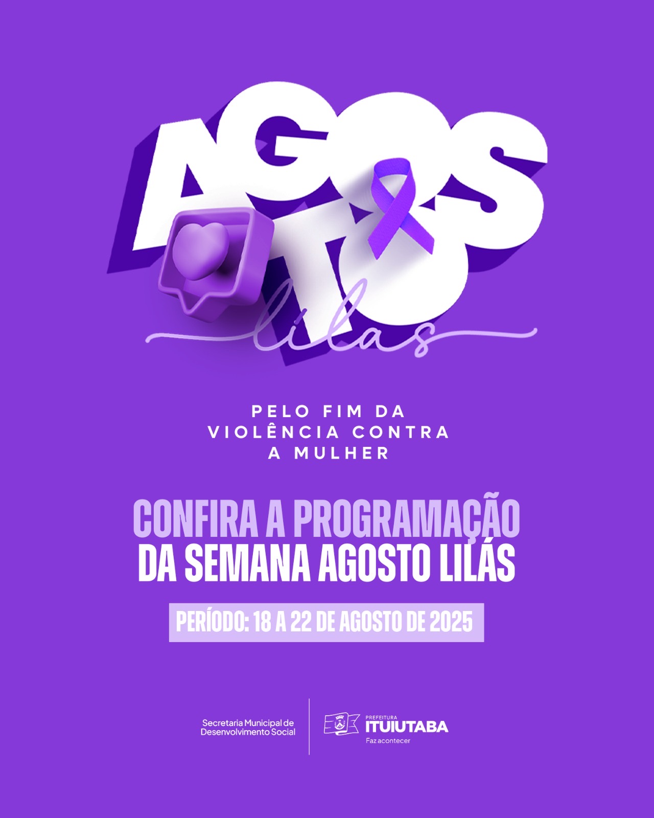 A Prefeitura de Ituiutaba, por meio da Secretaria de Desenvolvimento Social, realiza de 18 a 22 de agosto a programação da Semana Agosto Lilás, campanha nacional dedicada à conscientização e ao combate à violência contra a mulher. As atividades serão concentradas no Centro de Referência e Atendimento à Mulher (CRAMI), no Calçadão e no auditório da FacMais.