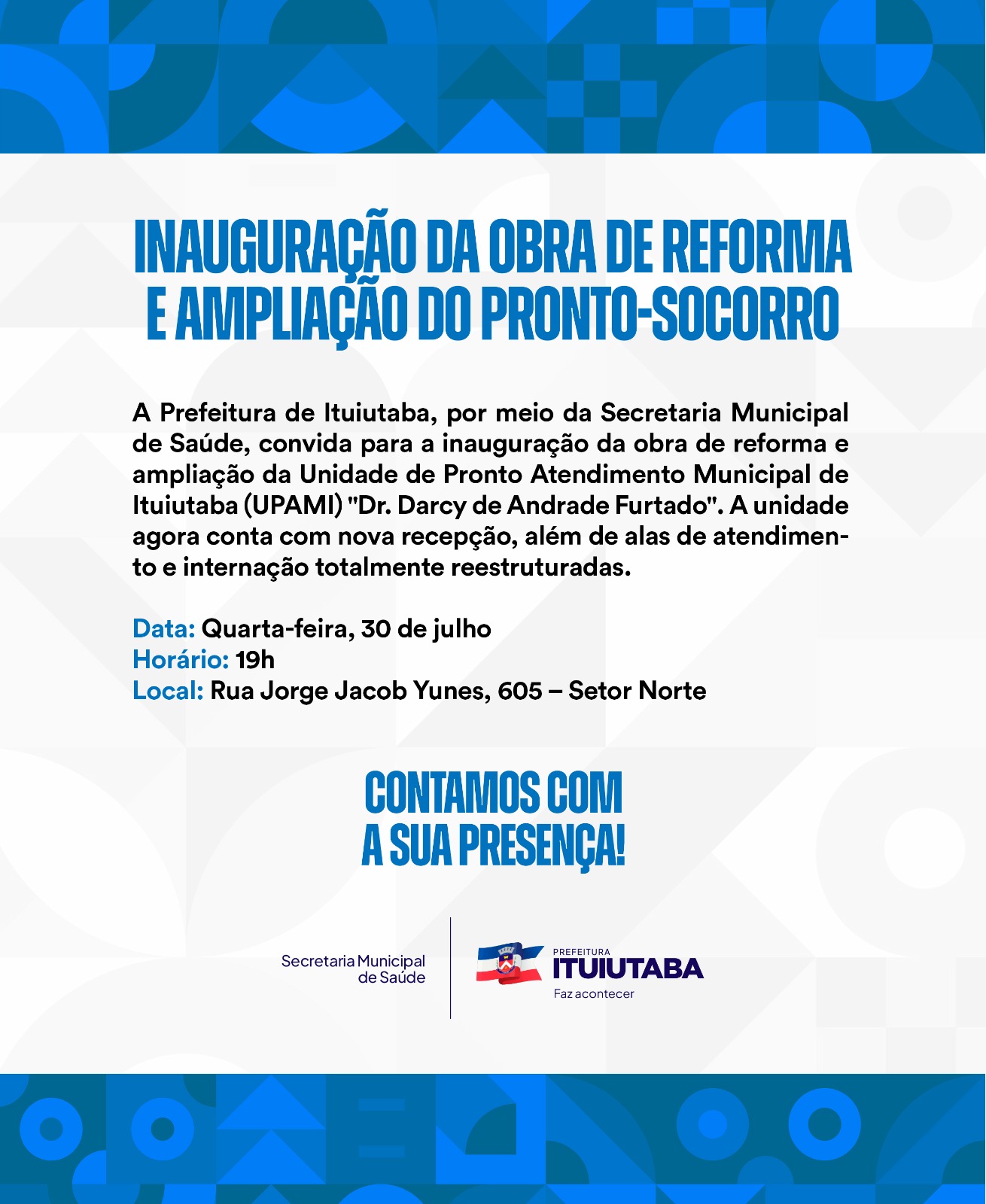 A Prefeitura de Ituiutaba, por meio da Secretaria de Saúde, realizará na próxima quarta-feira, 30 de julho, às 19h, a inauguração da obra de reforma e ampliação do Pronto-Socorro, a Unidade de Pronto Atendimento Municipal de Ituiutaba (UPAMI) “Dr. Darcy de Andrade Furtado”. A cerimônia acontecerá na sede da unidade, localizada na Rua Jorge Jacob Yunes, 605, no Setor Norte.